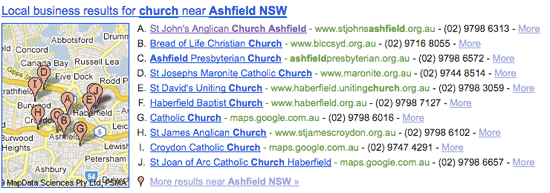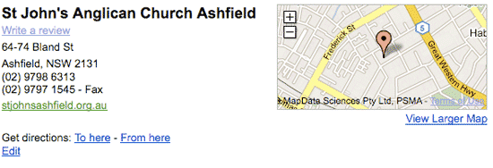 Firstly, people use Google (and Google Maps) to find places. Let's say you live in Ashfield and you want to find a church to go to on Good Friday (not wanting to promote a particular church, I randomly chose the first suburb I could think of starting with ‘A’: 'Ashfield’). In Google you type "church Ashfield", and what do you see? This: