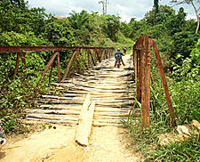Then the track narrowed. For most of the remaining 30km it was no wider than the motor bike. People and bikes we met on the way had to go into the bushes to make room for us. We were glad of our helmets- they protected our heads from the leaves and branches that whipped us as we passed. At times we had to duck under overhanging branches. At one point a huge fallen tree blocked the path- the drivers had to negotiate a temporary muddy track while the passengers walked. We started to look forward to the river crossings as an opportunity to get off the bike- the worse the bridge, the longer we could be off the bike.