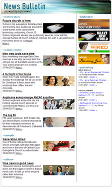 Email has replaced the envelope as the speediest way to communicate business communiqués and personal comments. For those of us who are constantly checking the contents of their inbox, sydneyanglicans.net has launched an email bulletin that each Monday will deliver the week's breaking news and the best new content in brief. Read the headlines, peruse the pictures, scan the intros " and decide whether you will click through, or save the update as a handy reference for cutting Christian thinking. The sydneyanglicans.net News Bulletin also includes links to the latest MP3s from Sydney's top preachers.