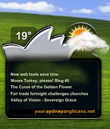 A widget is simply a small program designed to sit unobtrusively on your desk-top, delivering all sorts of handy information without much fuss. The sydneyanglicans.net widget delivers our top news stories and latest articles at a glance, along with the current temperature and weather conditions " just to let you know how the actual world is faring while you're surfing your virtual world. It's simple to install and easy to adjust so you receive just the right amount of information as the site updates throughout the day.