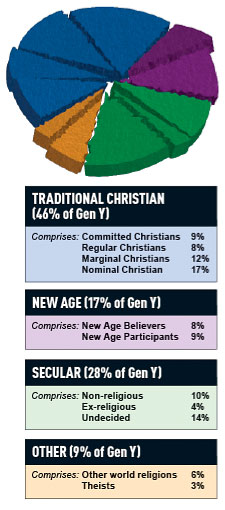 The reality is different. The true spiritual map of Generation Y is highly fragmented with a range of both "beliefs' and "unbeliefs' (see graph).