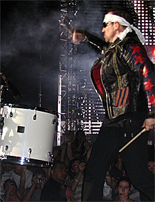 Bono is on the B-stage in front of us thrashing at one of Larry's drums, its Love and Peace. When the rage is over, he picks up a headband with the some graffiti on it. Larry's snare drum kicks in " it's an old favourite they haven't played for years, "Sunday Bloody Sunday'.