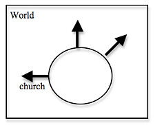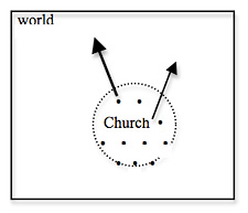 We could see the church as primarily existing to mission; to reach out to others. It becomes involved in God's mission of saving the lost. It exists for its non-members. In diagram form, it would look something like the topmost diagram. On the other hand you could argue that it is impossible to point to a thing called the church, as the church is a gathering of individuals. This would mean that the church does not mission, but individuals mission. As a diagram, it might look my second diagram.