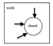 A third alternative is that, according the Ephesians, the very existence of the church, where Jew and gentile are gathered together in union with Christ, is a statement to all creatures " visible and invisible " of the character and victory of Christ. In that sense, the existence of the church does the ‘missioning’. As a diagram that would look the final diagram.