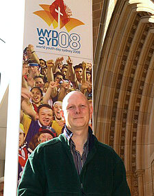 It's the week before the Pope arrives now and I'm at the registration office in Chippendale to collect my press pass " I couldn't help chalking "Certainty" outside the front door " the security guard asked me what I was doing, I smiled and said I wanted people to know about certainty, he seemed happy enough. The registration process has been a bit difficult and they don't seem to be able to find my pass, but the people there are lovely. They go to a lot of effort to sort things out. There are young people from many different countries manning the desks. An Aussie girl with a ring through her lip seems to be in charge. A French girl wearing a scarf is also very helpful. She has come to Australia on a working visa for WYD and is trying to immigrate because things are very tough in Europe at the moment. I wasn't aware. Next I meet an Irish guy who also came out on a working visa for WYD and is looking forward to a holiday after it is all over. The conversation seemed to stop when I told him I was working for the Anglican Church. Finally I meet an Asian girl from Melbourne who has been working for WYD for 6 months. I ask her if she is paid. She says no, just free accommodation. I say, that's quite a commitment! She says that she will only ever be part of one WYD in her life. I ask what she is looking forward to most, and she says "meeting all the different people, I'm not so excited about meeting the pope, just the people". She graciously sorts out all the mistakes I made in my registration " in my defense, it was a pretty tricky registration process.